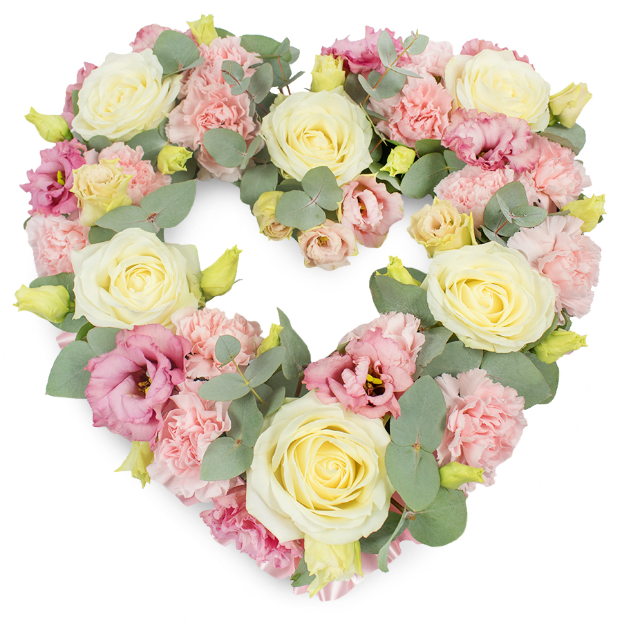 Show your deepest sympathy with our premium open heart arrangement. This elegant bouquet features a refined selection of white roses, soft pink carnations, exquisite pink lisianthus, and aromatic eucalyptus leaves, thoughtfully arranged to honor and remember.